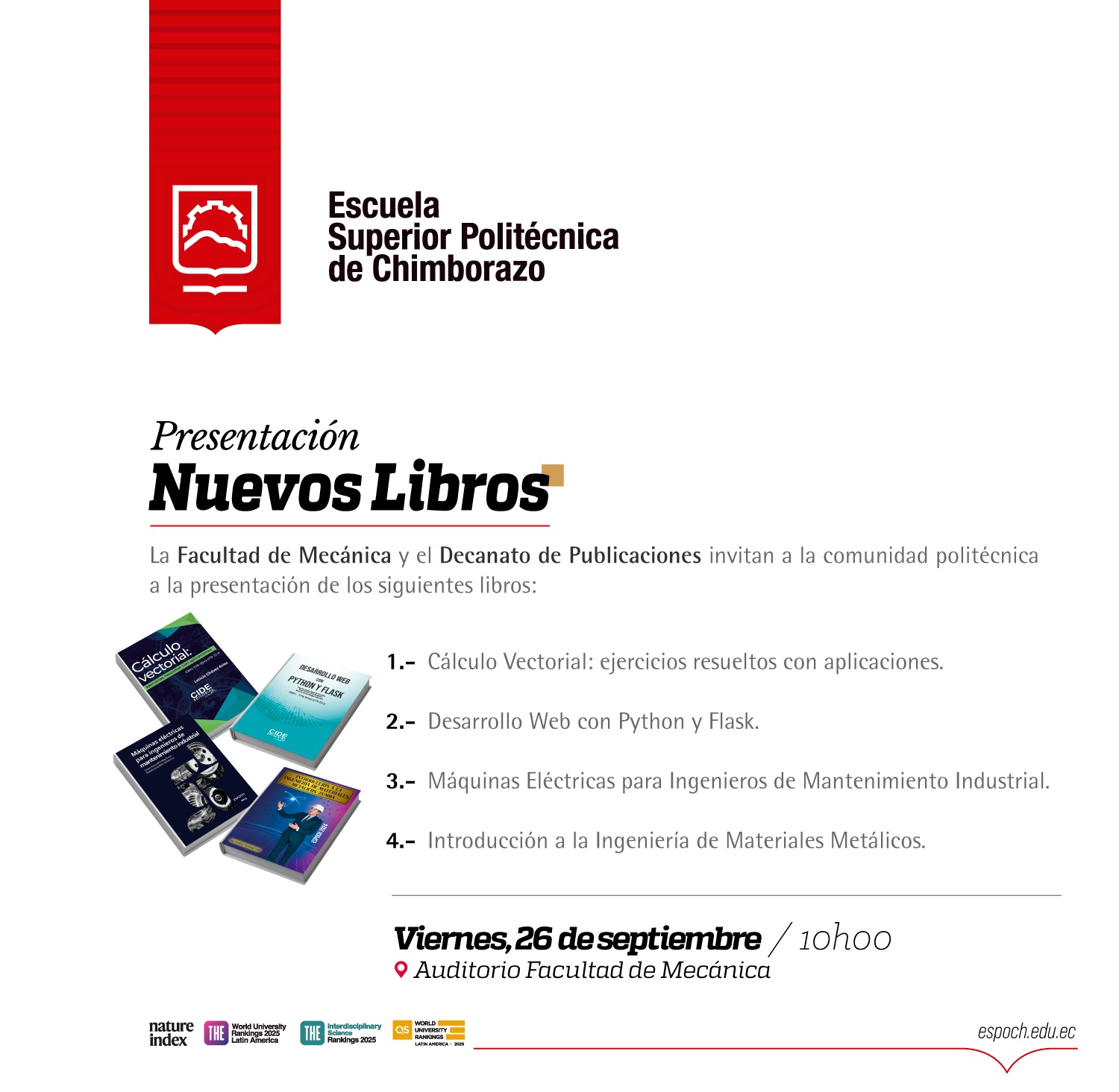 La Escuela Superior Politécnica de Chimborazo, a través del Decanato de Publicaciones, invita a la comunidad académica al lanzamiento de diversas obras de investigación desarrolladas por docentes de la Facultad de Ciencias. Estas publicaciones representan el resultado de rigurosos estudios en distintas áreas del conocimiento y contribuyen al avance de la ciencia y la educación....