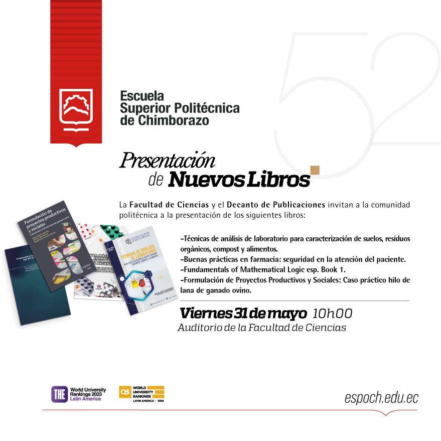 La #ESPOCH, a través del Decanato de Publicaciones, invita a la comunidad politécnica de la Facultad de Ciencias a la presentación de libros politécnicos, fruto del trabajo de nuestros docentes e investigadores. El evento se desarrollará el viernes 31 de este mes en el Auditorio de la Facultad de Ciencias. Con la presentación de...