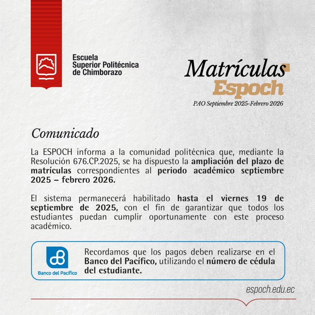 La #ESPOCH informa que se amplía el plazo de matrículas para el periodo académico septiembre 2025 – febrero 2026.