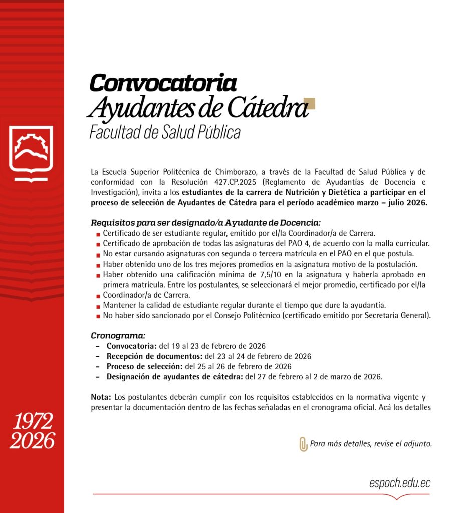 Cronograma: La publicación de la convocatoria se realizará del 19 al 23 de febrero de 2026; la recepción de documentos será del 23 al 24 de febrero de 2026; el proceso de selección, a cargo de la Comisión Académica de la FSP, se desarrollará del 25 al 26 de febrero de 2026; y la designación de ayudantes de cátedra, por parte del Decano de la FSP, se efectuará del 27 de febrero al 2 de marzo de 2026.