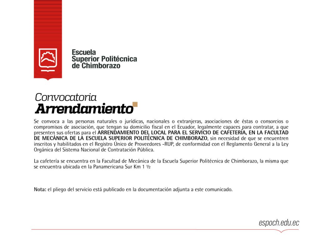 Se convoca a las personas naturales o jurídicas, nacionales o extranjeras, asociaciones de éstas o consorcios o compromisos de asociación, que tengan su domicilio fiscal en el Ecuador, legalmente capaces para contratar, a que presenten sus ofertas para el ARRENDAMIENTO DEL LOCAL PARA EL SERVICIO DE CAFETERÍA, EN LA FACULTAD DE MECÁNICA DE LA ESCUELA SUPERIOR POLITÉCNICA DE CHIMBORAZO, sin necesidad de que se encuentren inscritos y habilitados en el Registro Único de Proveedores -RUP, de conformidad con el Reglamento General a la Ley Orgánica del Sistema Nacional de Contratación Pública.