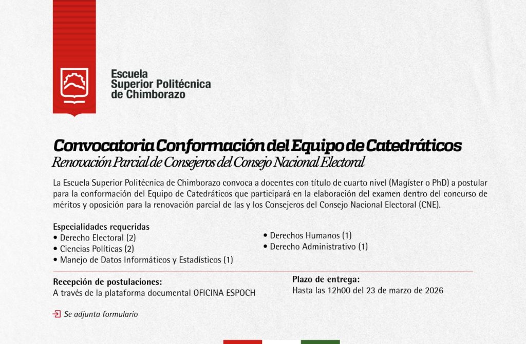La ESPOCH pone en conocimiento de su comunidad docente la convocatoria para la conformación del Equipo de Catedráticos, en el marco del proceso de renovación parcial de las y los Consejeros del Consejo Nacional Electoral (CNE).