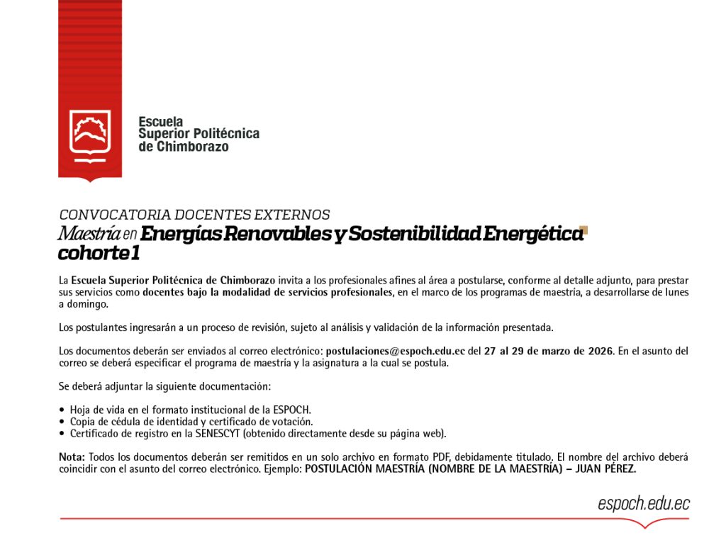 Los documentos deberán ser enviados al correo electrónico: postulaciones@espoch.edu.ec del 27 al 29 de marzo de 2026. En el asunto del correo se deberá especificar el programa de maestría y la asignatura a la cual se postula.