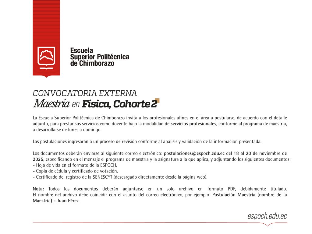 La Escuela Superior Politécnica de Chimborazo invita a los profesionales afines en el área a postularse, de acuerdo con el detalle adjunto, para prestar sus servicios como docente bajo la modalidad de servicios profesionales, conforme al programa de maestría, a desarrollarse de lunes a domingo.