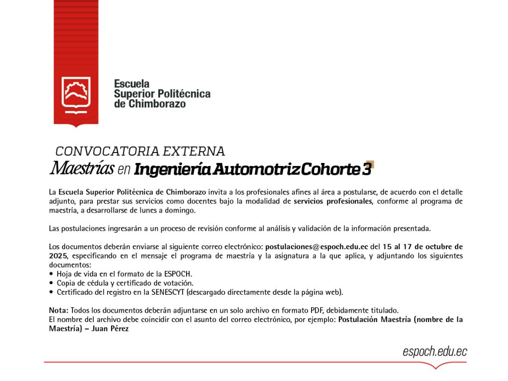 Los documentos deberán enviarse al siguiente correo electrónico: postulaciones@espoch.edu.ec del 15 al 17 de octubre de 2025, especificando en el mensaje el programa de maestría y la asignatura a la que aplica, y adjuntando los siguientes documentos: