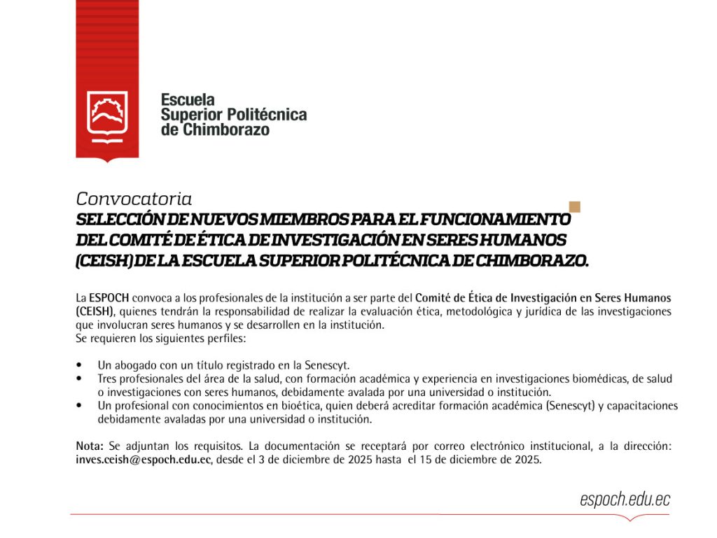 La ESPOCH convoca a los profesionales de la institución a ser parte del Comité de Ética de Investigación en Seres Humanos (CEISH), quienes tendrán la responsabilidad de realizar la evaluación ética, metodológica y jurídica de las investigaciones que involucran seres humanos y se desarrollen en la institución.