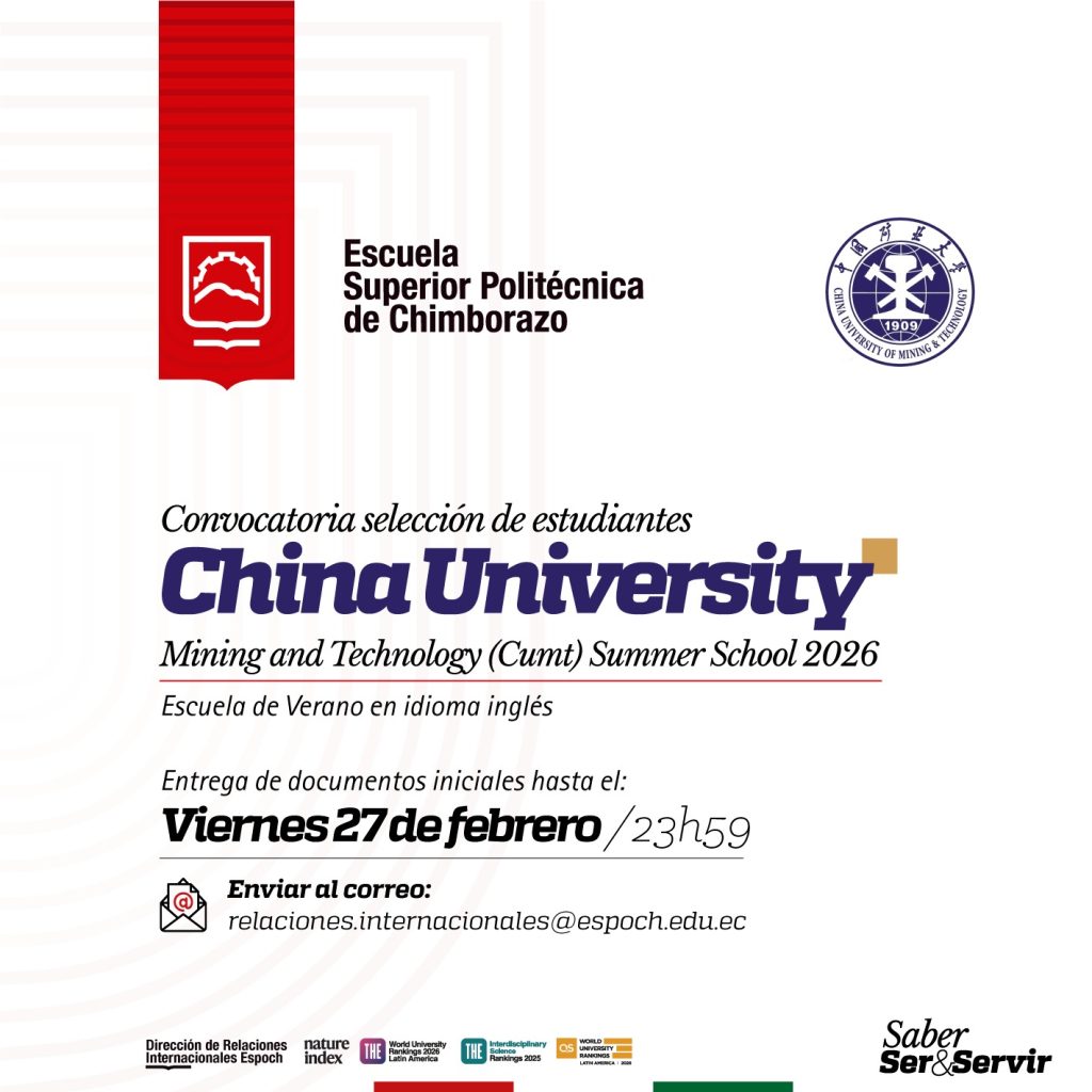 La Escuela Superior Politécnica de Chimborazo (ESPOCH), a través de la Dirección de Relaciones Internacionales, informa a su comunidad estudiantil y profesional sobre la apertura de la convocatoria al programa de becas ofrecido por la China University of Mining and Technology (CUMT), una de las instituciones de educación superior más reconocidas en el ámbito de la ingeniería, tecnología y ciencias aplicadas en la República Popular China.