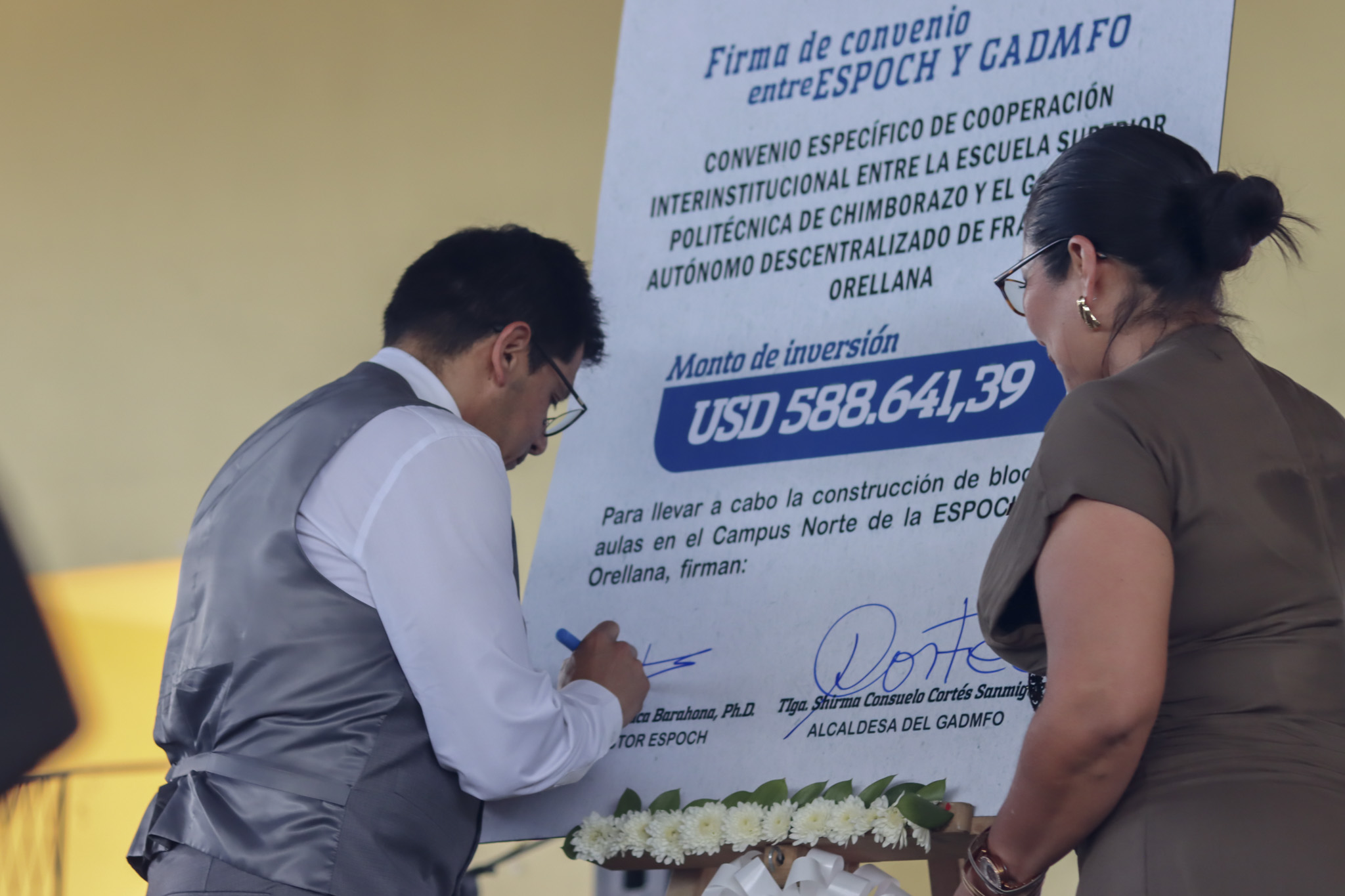 Uno de los momentos más significativos fue la firma de la carta de intención entre la ESPOCH y el GAD Municipal de Francisco de Orellana, representado por la Tecnóloga Shilma Cortés, alcaldesa del cantón, para la construcción del bloque de aulas del Campus Norte de la Sede Orellana, con una inversión estimada de 588.641 dólares. Este proyecto constituye un importante avance para la expansión y fortalecimiento de la infraestructura académica, reafirmando el crecimiento sostenido de la sede.