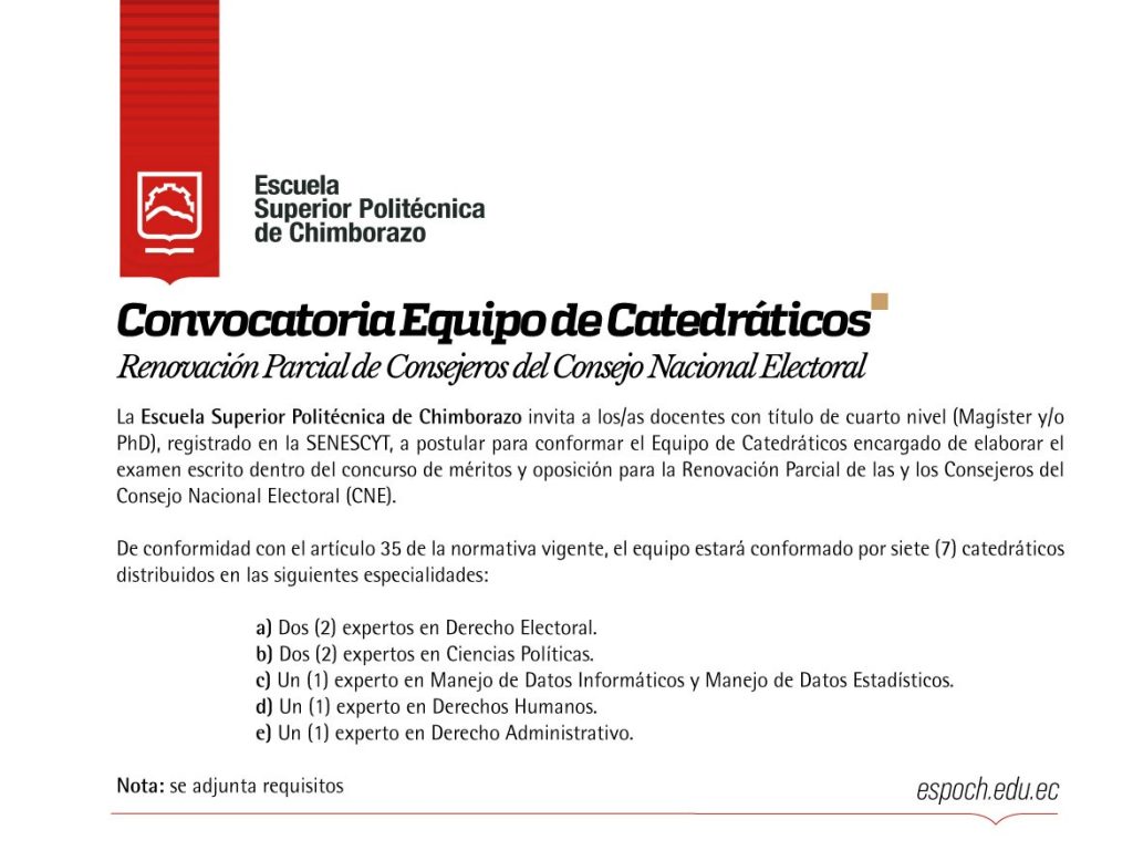 La Escuela Superior Politécnica de Chimborazo invita a docentes con título de cuarto nivel (Magíster y/o PhD), registrado en la SENESCYT, a postular para conformar el Equipo de Catedráticos encargado de elaborar el examen escrito del concurso de méritos y oposición para la Renovación Parcial de las y los Consejeros del Consejo Nacional Electoral (CNE). El equipo estará integrado por siete especialistas en Derecho Electoral, Ciencias Políticas, Manejo de Datos Informáticos y Estadísticos, Derechos Humanos y Derecho Administrativo, conforme a la normativa vigente