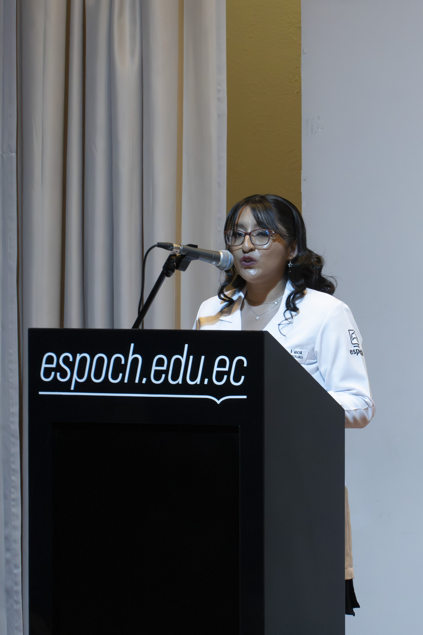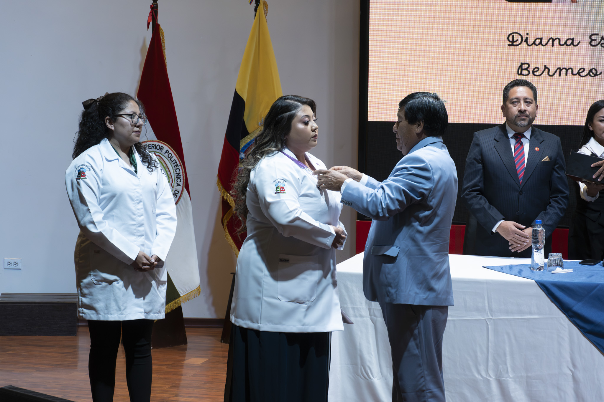 La ceremonia contó con la presencia de autoridades académicas, entre ellas la Ing. Jenny Basantes, Vicerrectora Académica; el Ing. Pablo Andino, Decano de la Facultad de Ciencias Pecuarias; la Ing. Paula Toalombo, Subdecana de la facultad; el Ing. Iván Flores, PhD., Coordinador de la Carrera de Medicina Veterinaria; así como coordinadores de carrera, docentes, estudiantes y familiares.