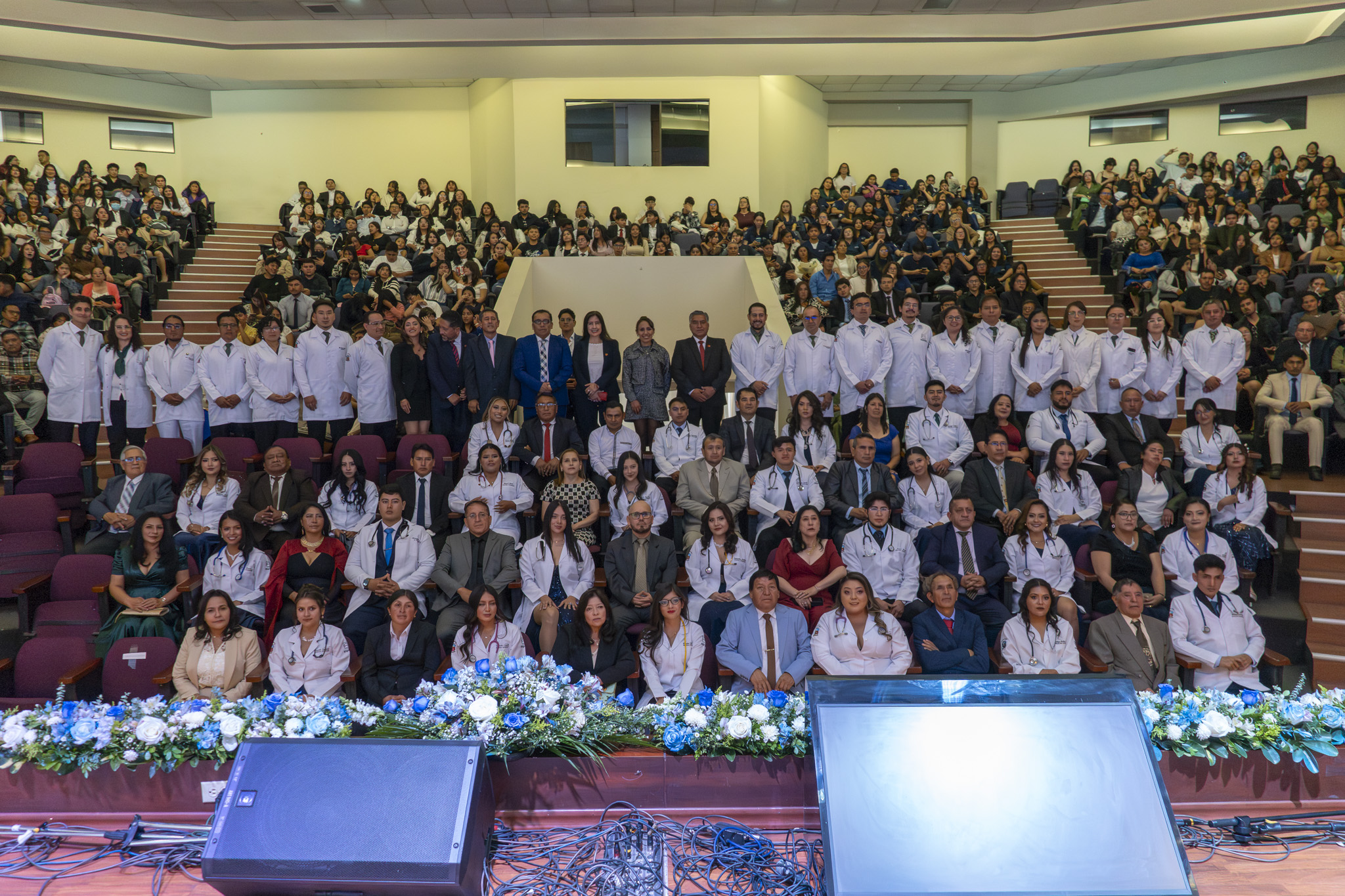 El momento central fue la imposición de mandiles, en la que cada estudiante ingresó acompañado de un familiar. El docente designado colocó el mandil, mientras que el familiar entregó el fonendoscopio, reafirmando el valor del apoyo afectivo y familiar en el proceso formativo.