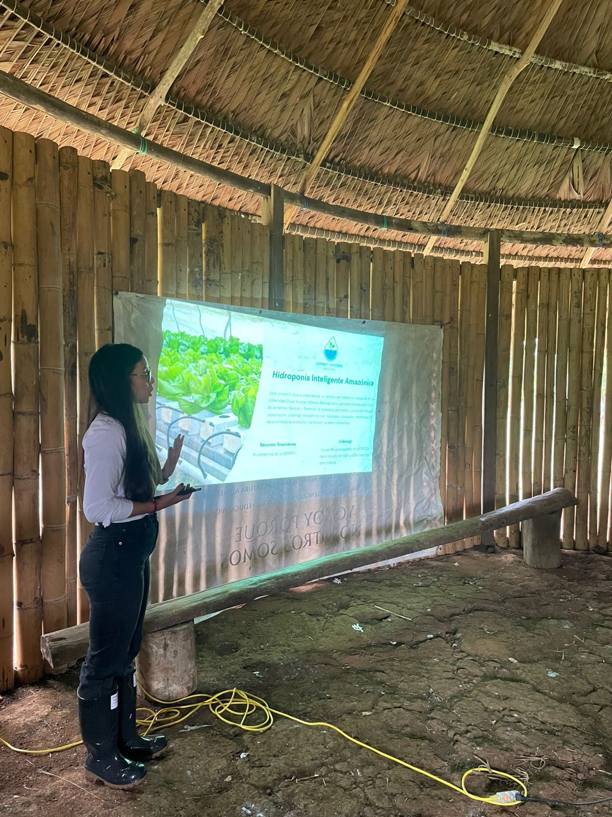 Los docentes explicaron que el proyecto contempla componentes relacionados con la mejora de los procesos productivos, como la elaboración tradicional de la chicha de yuca, la documentación cultural mediante registros audiovisuales y la difusión digital de productos comunitarios. Asimismo, se expuso la implementación del proyecto Hidroponía Inteligente Amazónica, enfocado en fortalecer la soberanía alimentaria a través de sistemas hidropónicos adaptados al contexto amazónico y procesos de capacitación técnica comunitaria, respetando la cosmovisión y la identidad del pueblo Shuar.