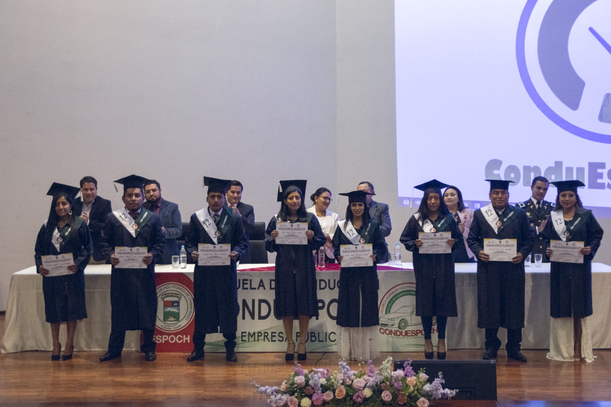 La Empresa Pública Escuela de Conducción ESPOCH (CONDUESPOCH E.P.) incorporó a su décima segunda promoción de conductores que están habilitados para obtener la licencia profesional tipo C. Autoridades, docentes y