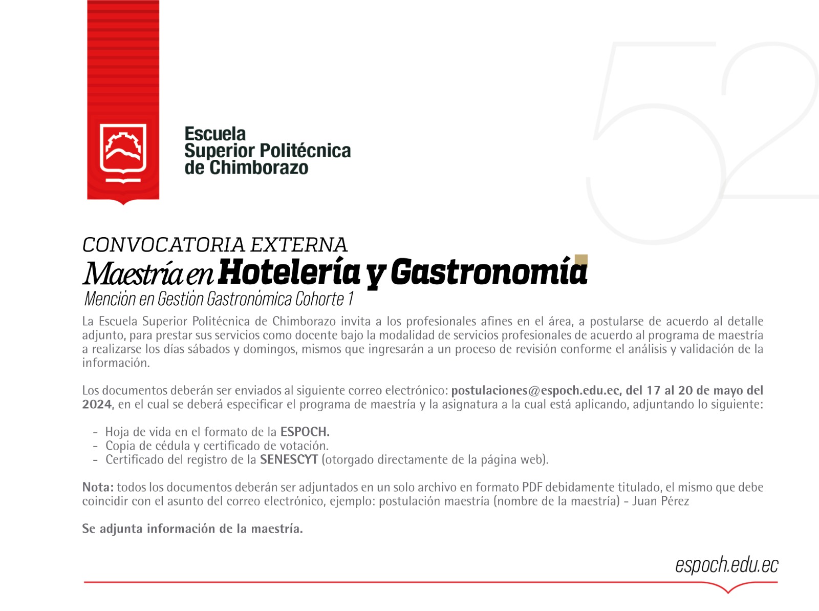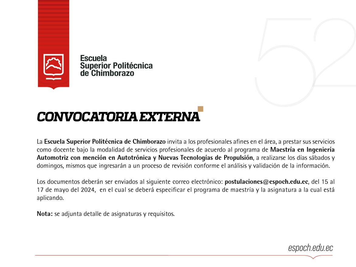 La Escuela Superior Politécnica de Chimborazo invita a los profesionales afines en el área, a postularse de acuerdo al detalle adjunto, para prestar sus servicios como docente bajo la modalidad
