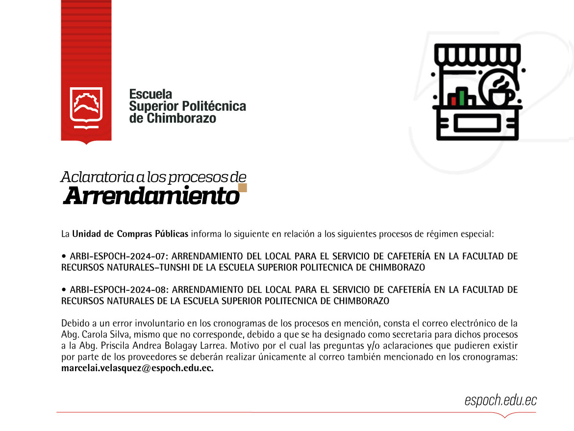 ACLARATORIA A LOS PROCESOS DE ARRENDAMIENTO La Unidad de Compras Públicas informa lo siguiente en relación a los siguientes procesos de régimen especial: • ARBI-ESPOCH-2024-07: ARRENDAMIENTO DEL LOCAL PARA