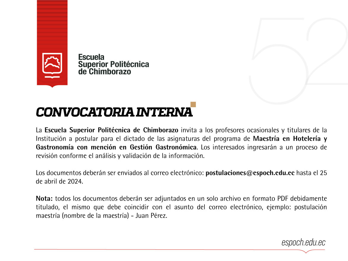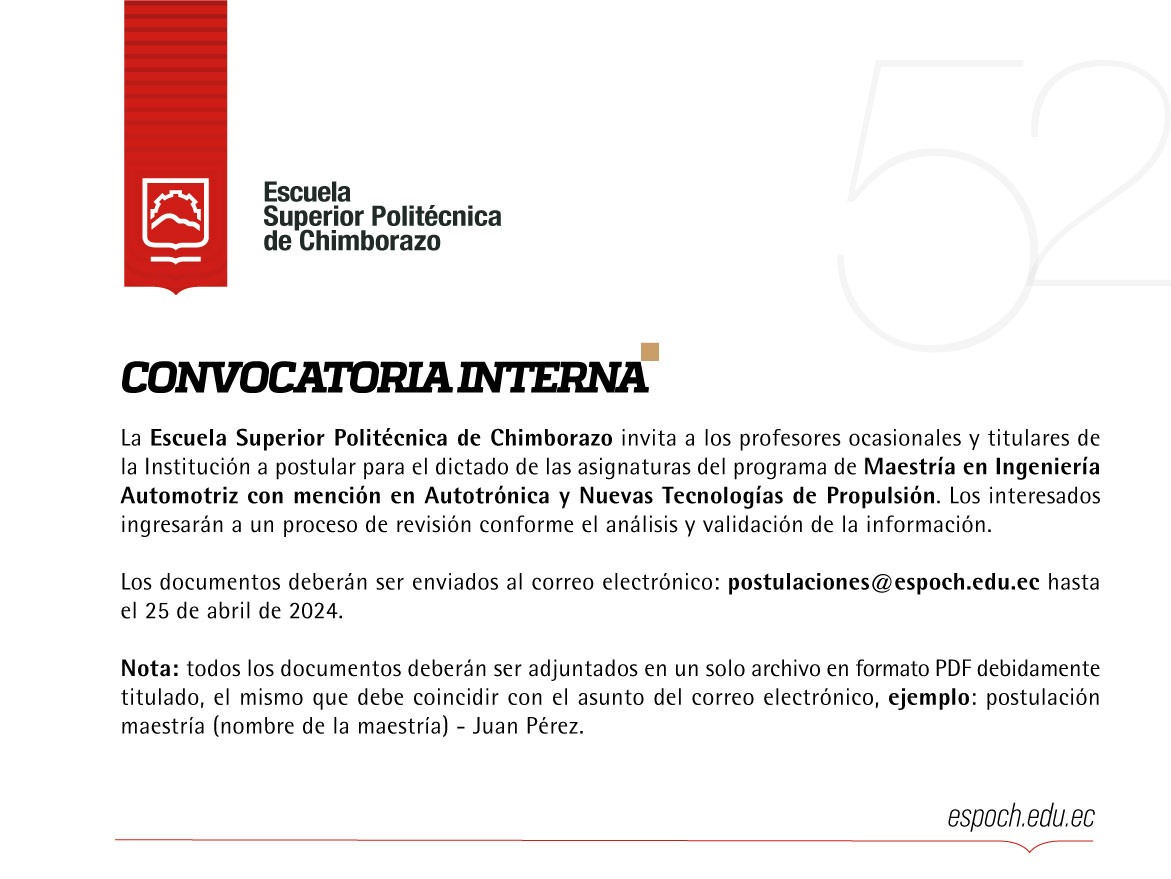 La Escuela Superior Politécnica de Chimborazo invita a profesionales afines a postularse como docentes para el programa de maestría que se realizará los sábados y domingos. Los interesados deben enviar