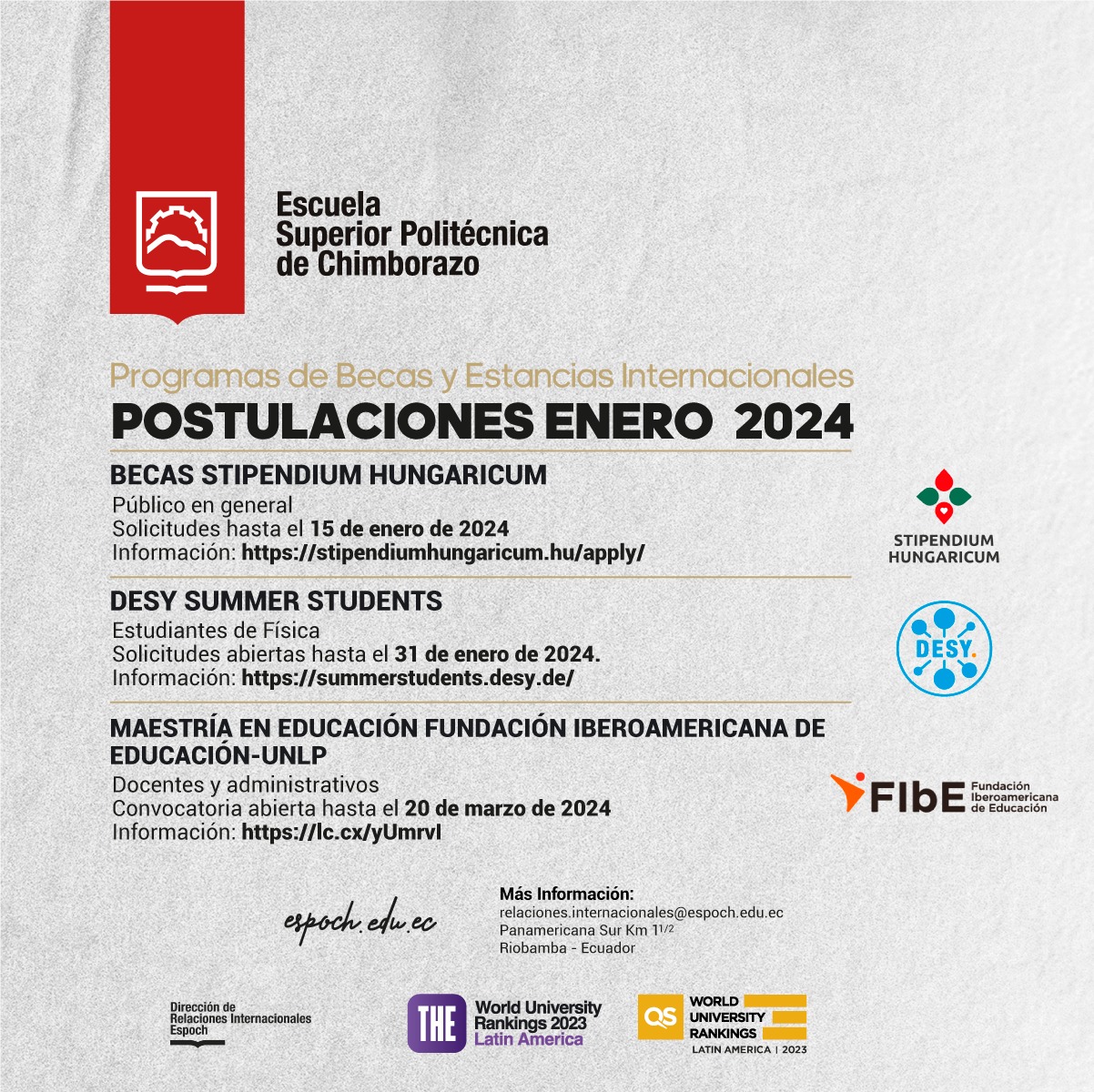 Programas de Becas y Estancias Internacionales – Postulaciones enero 2024 BECAS STIPENDIUM HUNGARICUMPúblico en generalSolicitudes hasta el 15 de enero de 2024https://stipendiumhungaricum.hu/apply/ DESY SUMMER STUDENTSEstudiantes de FísicaSolicitudes abiertas hasta el