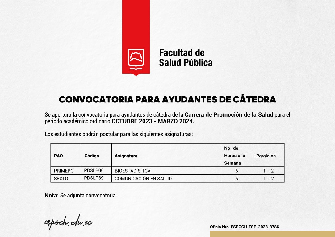 Se invita a los estudiantes de la Facultad de Salud Pública a participar en la convocatoria para asistentes de cátedra durante el período académico ordinario de octubre de 2024 a