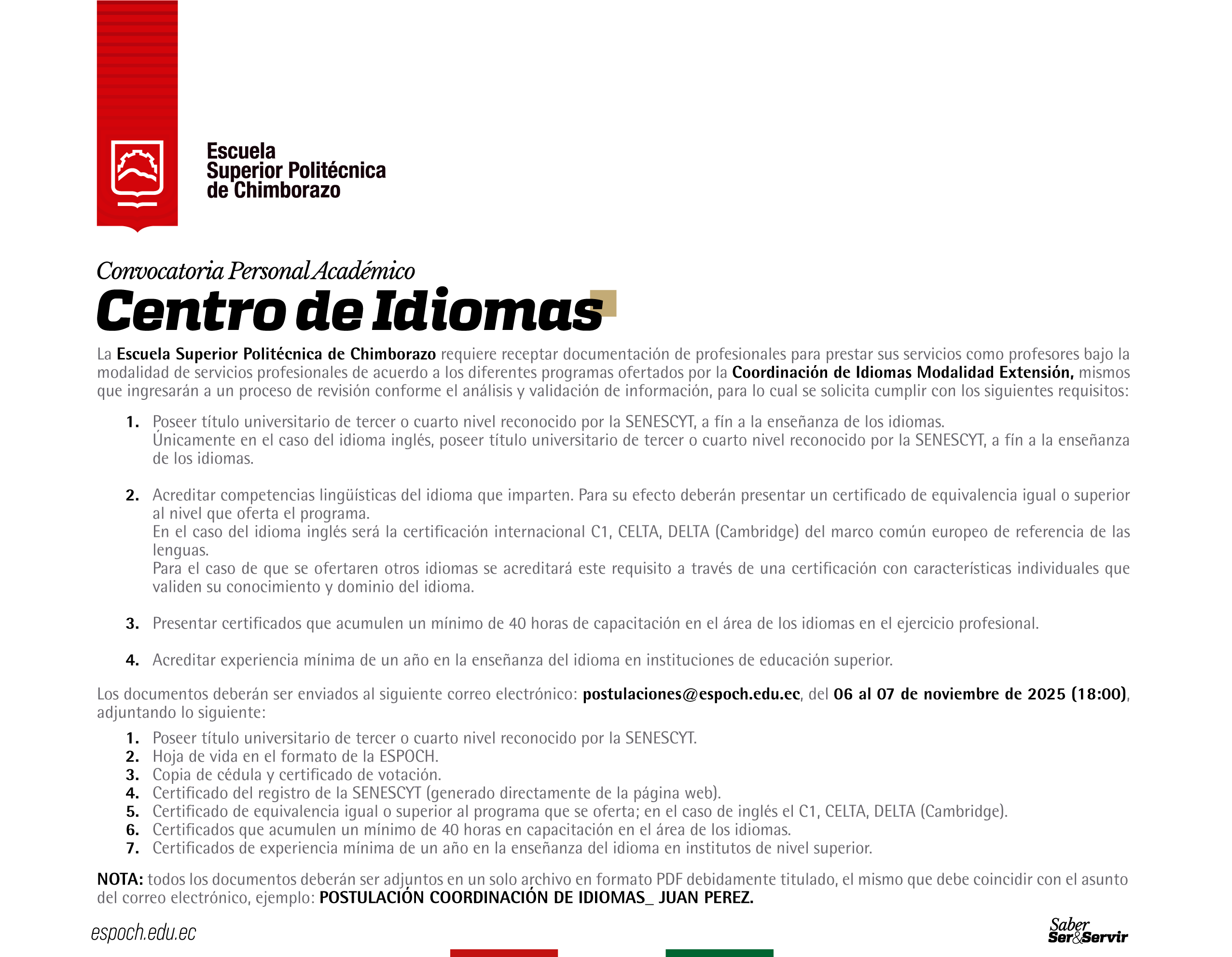 La Escuela Superior Politécnica de Chimborazo invita a los profesionales afines en el área a postularse, de acuerdo con el detalle adjunto, para prestar sus servicios como docente bajo la