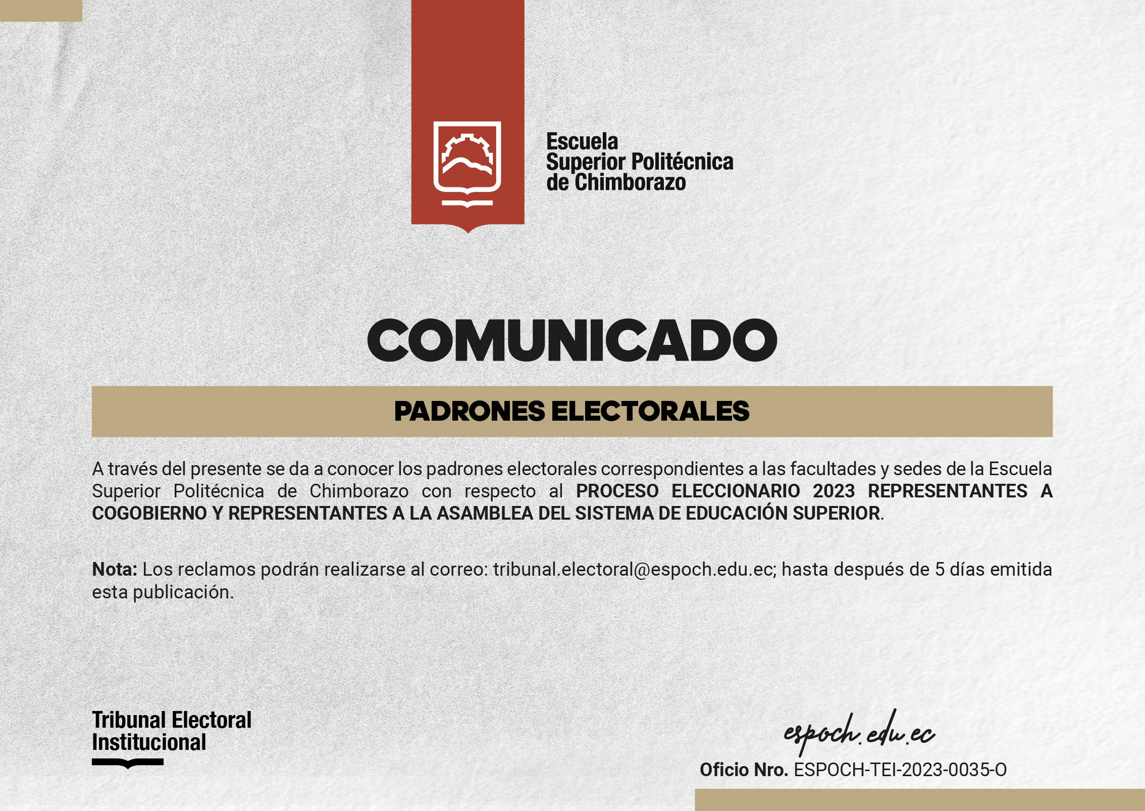 PADRONES ELECTORALES A través del presente se da a conocer los padrones electorales correspondientes a las facultades y sedes de la Escuela Superior Politécnica de Chimborazo con respecto al PROCESO