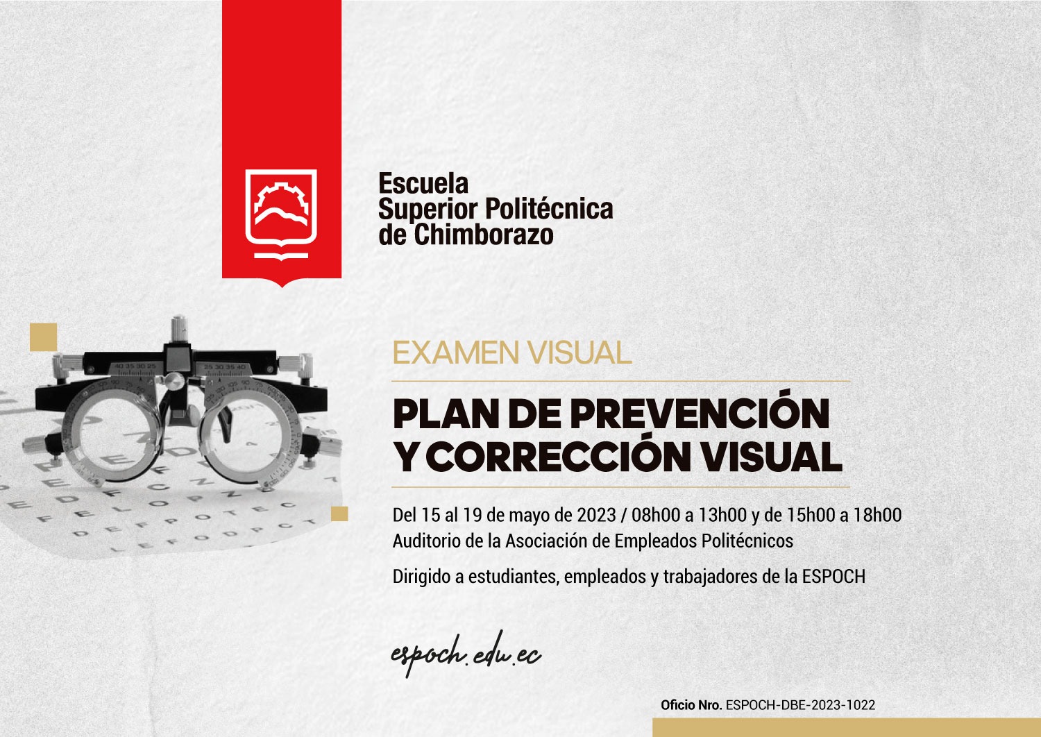 Invitamos a la comunidad politécnica de la ESPOCH a participar en las brigadas de salud visual, servicio brindado por Visual Optics. Estas brigadas se llevarán a cabo del 15 al