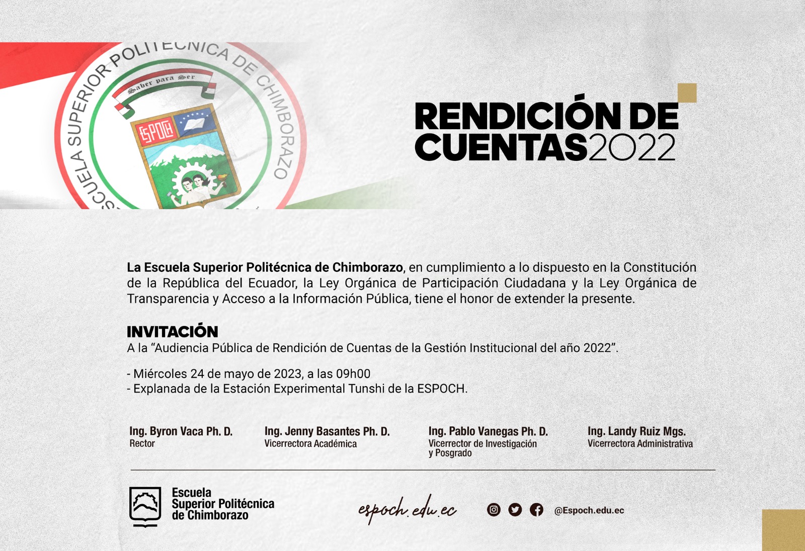 La Escuela Superior Politécnica de Chimborazo, en estricto cumplimiento de la Constitución de la República del Ecuador, la Ley Orgánica de Participación Ciudadana y la Ley Orgánica de Transparencia y