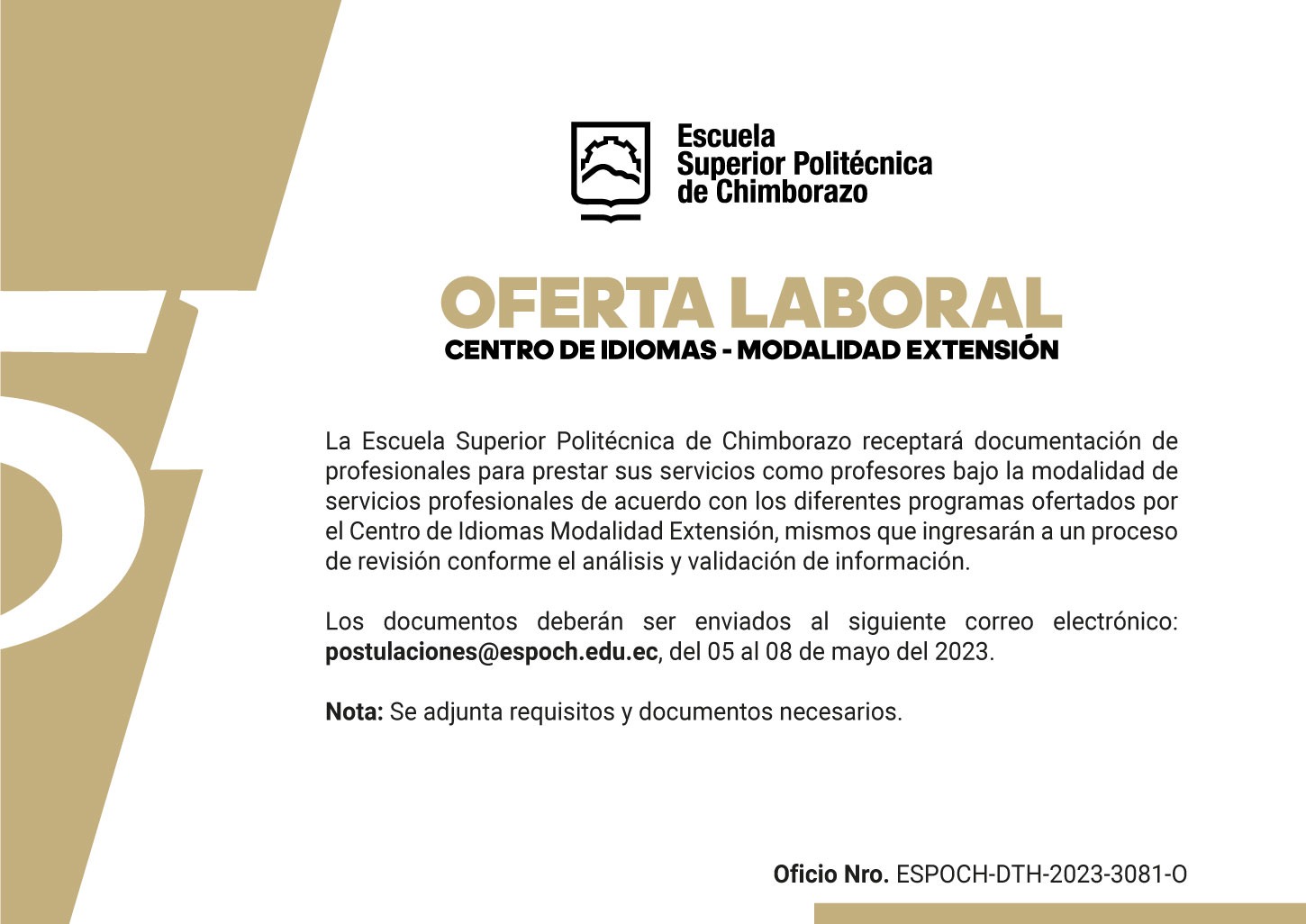 La Escuela Superior Politécnica de Chimborazo receptará documentación de profesionales para prestar sus servicios como profesores bajo la modalidad de servicios profesionales de acuerdo con los diferentes programas ofertados por