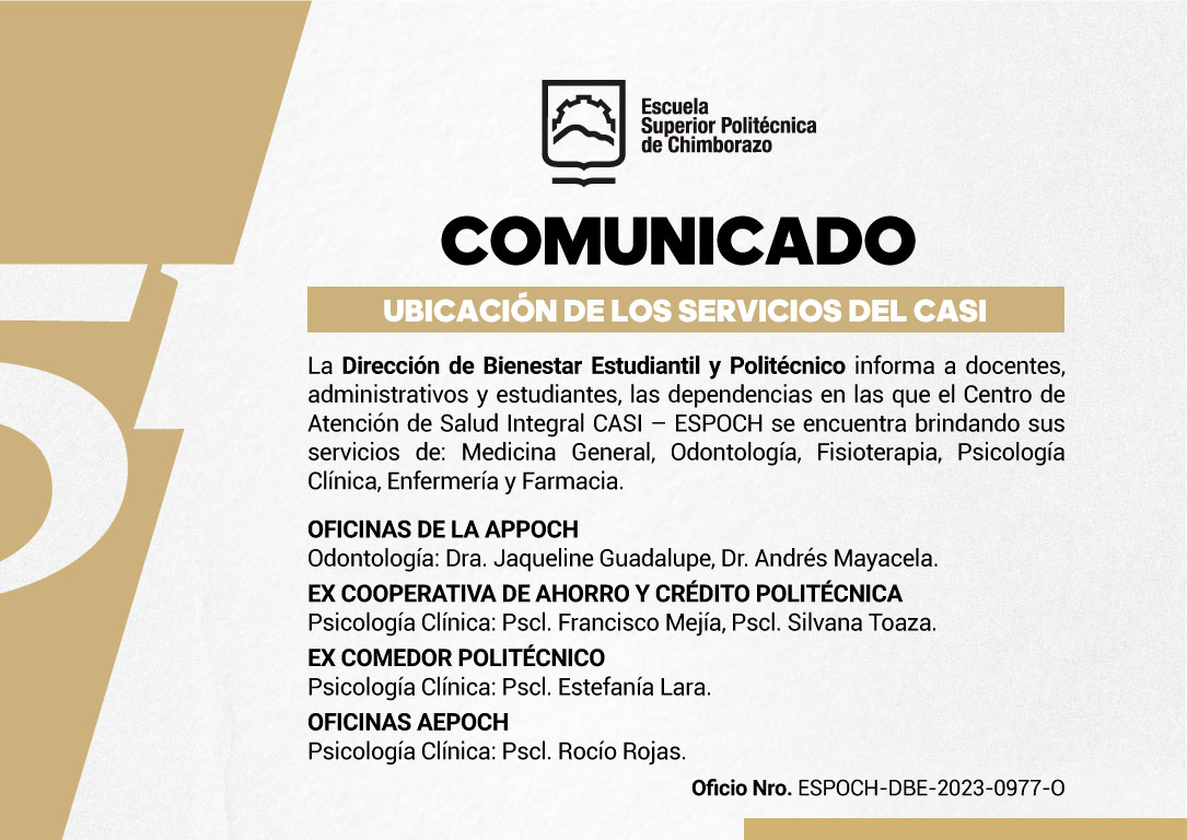 Ubicación de los servicios del CASI La Dirección de Bienestar Estudiantil y Politécnico informa a docentes, administrativos y estudiantes, las dependencias en las que el Centro de Atención de Salud