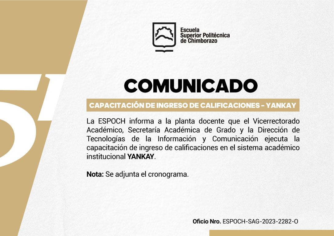 Capacitación de Ingreso de Calificaciones – YANKAY La ESPOCH informa a la planta docente que el Vicerrectorado Académico, Secretaría Académica de Grado y la Dirección de Tecnologías de la Información