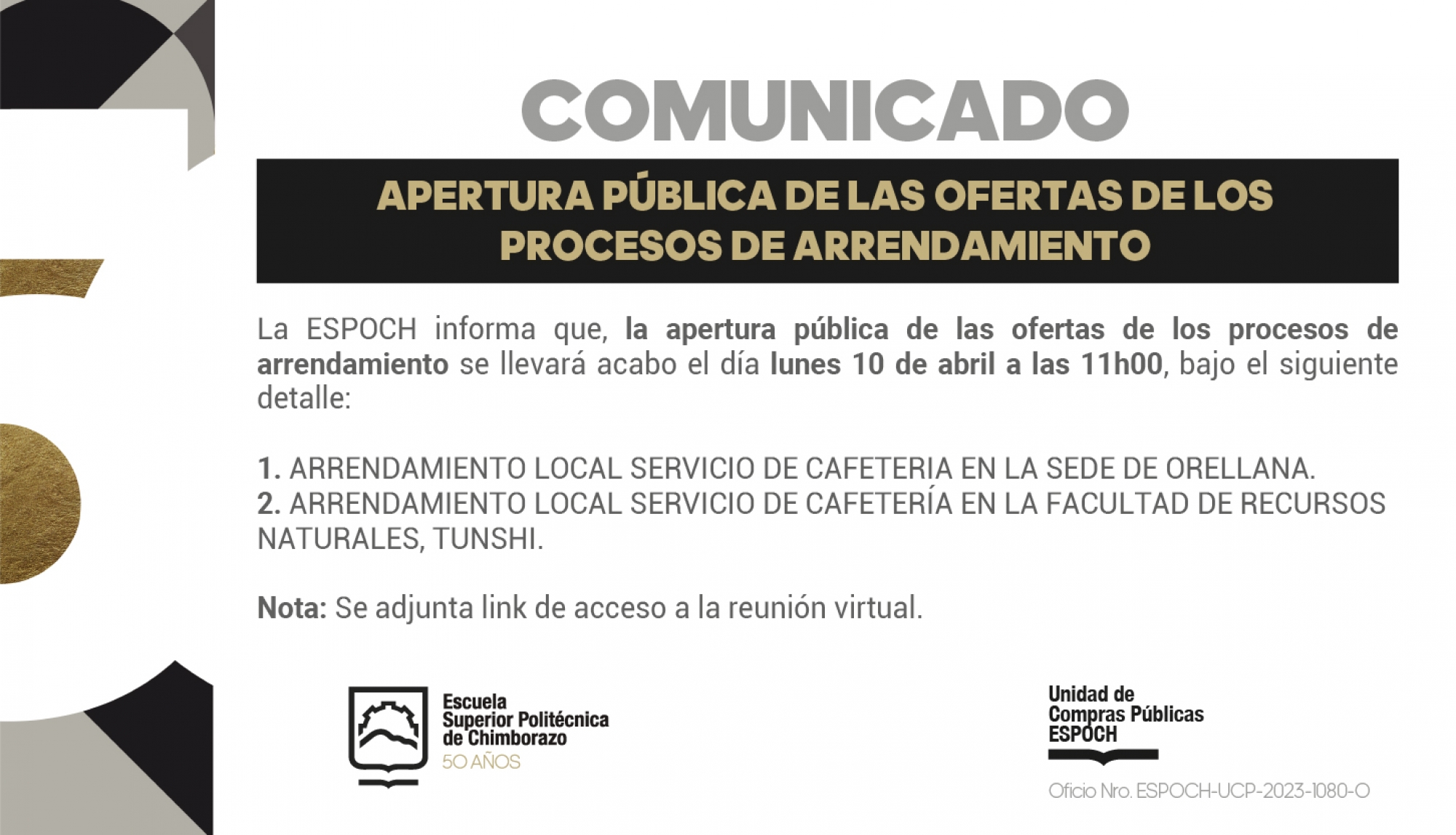 C A La ESPOCH informa que el día 11 de Abril del 2023 (18:00) se cumple con la etapa de pedido de CONVALIDACIÓN DE ERRORES de los siguientes procesos: 1.