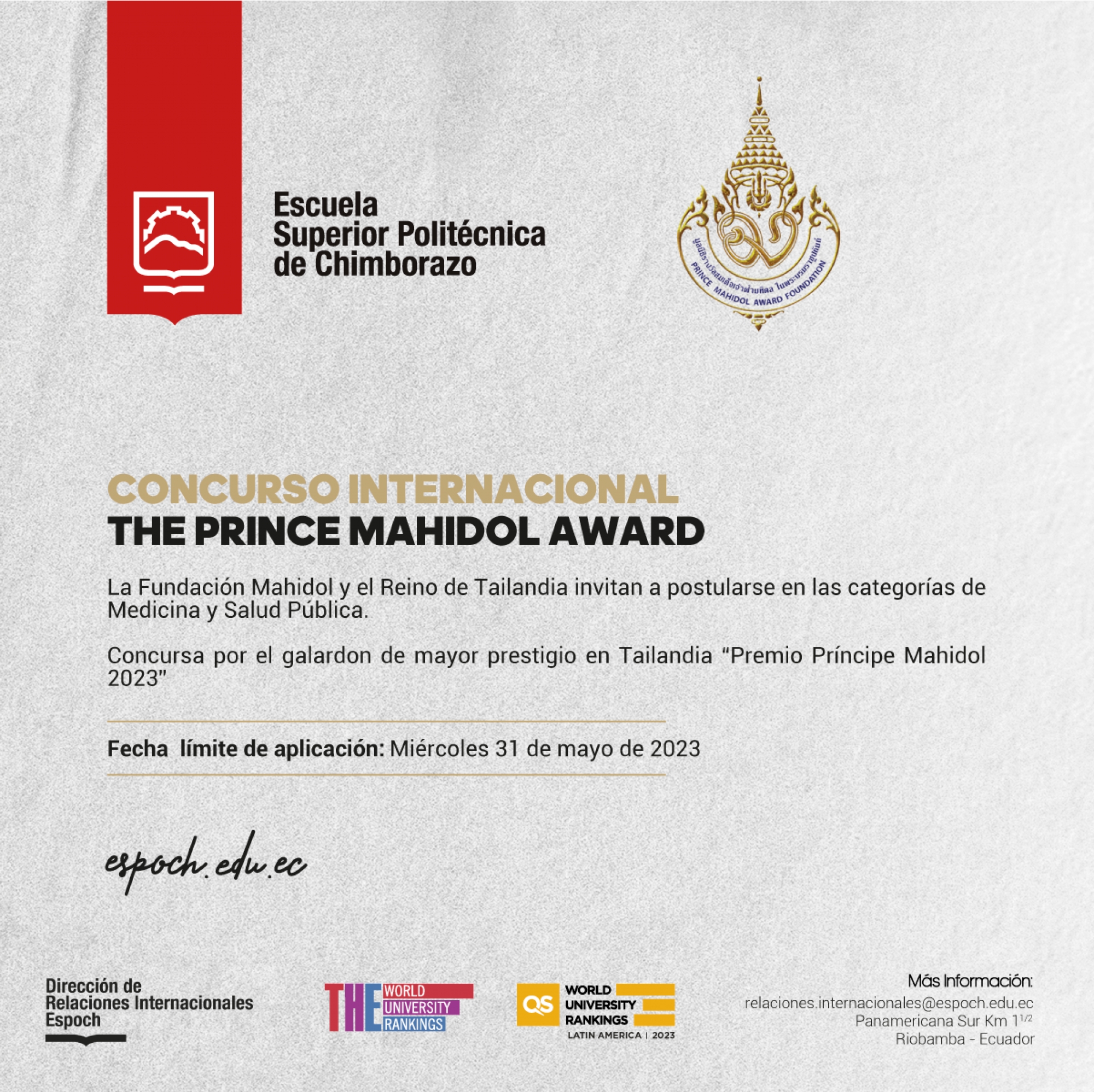 C Te invitamos a participar en el concurso THE PRINCE MAHIDOL AWARD para obtener el Galardón de mayor prestigio en Tailandia, “Premio Príncipe Mahidol 2023”. Dicho premio se concede sobre una base anual,