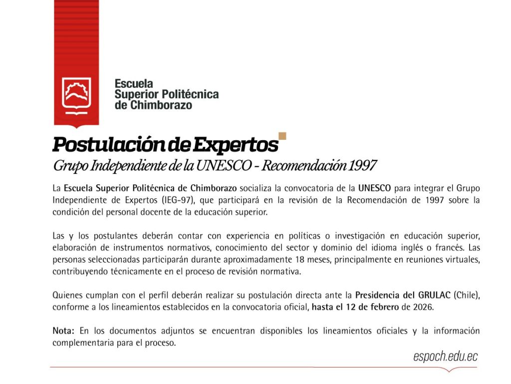 La Escuela Superior Politécnica de Chimborazo socializa la convocatoria de la UNESCO para integrar el Grupo Independiente de Expertos (IEG-97), instancia que participará en la revisión de la Recomendación de 1997 sobre la condición del personal docente de la educación superior. La postulación está dirigida a profesionales con experiencia en políticas o investigación en educación superior y dominio de inglés o francés.
